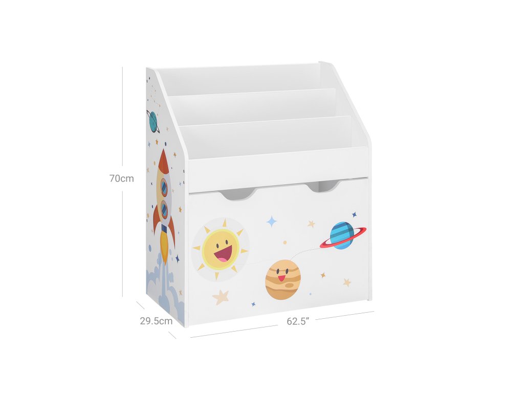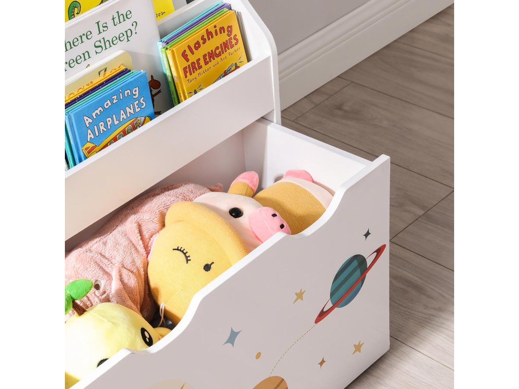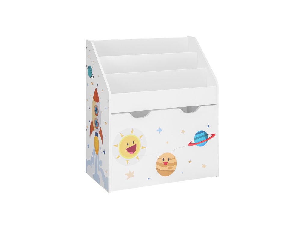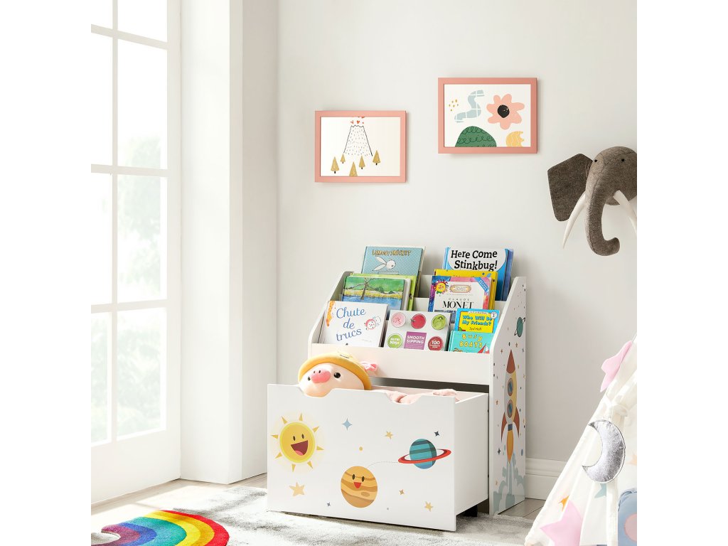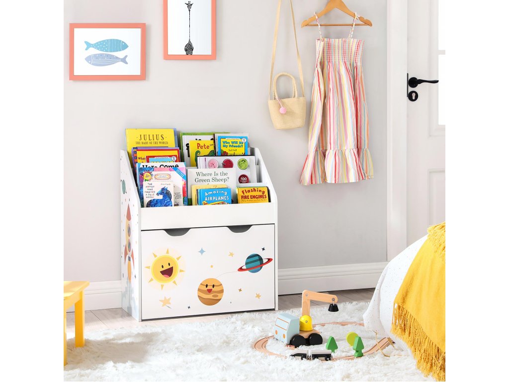 Malý astronaut si tuto vesmírně laděnou knihovničku zamiluje! Může si představovat, že je na palubě rakety a objevuje svět plný fantazie skrze knihy a hračky – a zároveň se snadno naučí, jak věci vracet zpět na své místo.